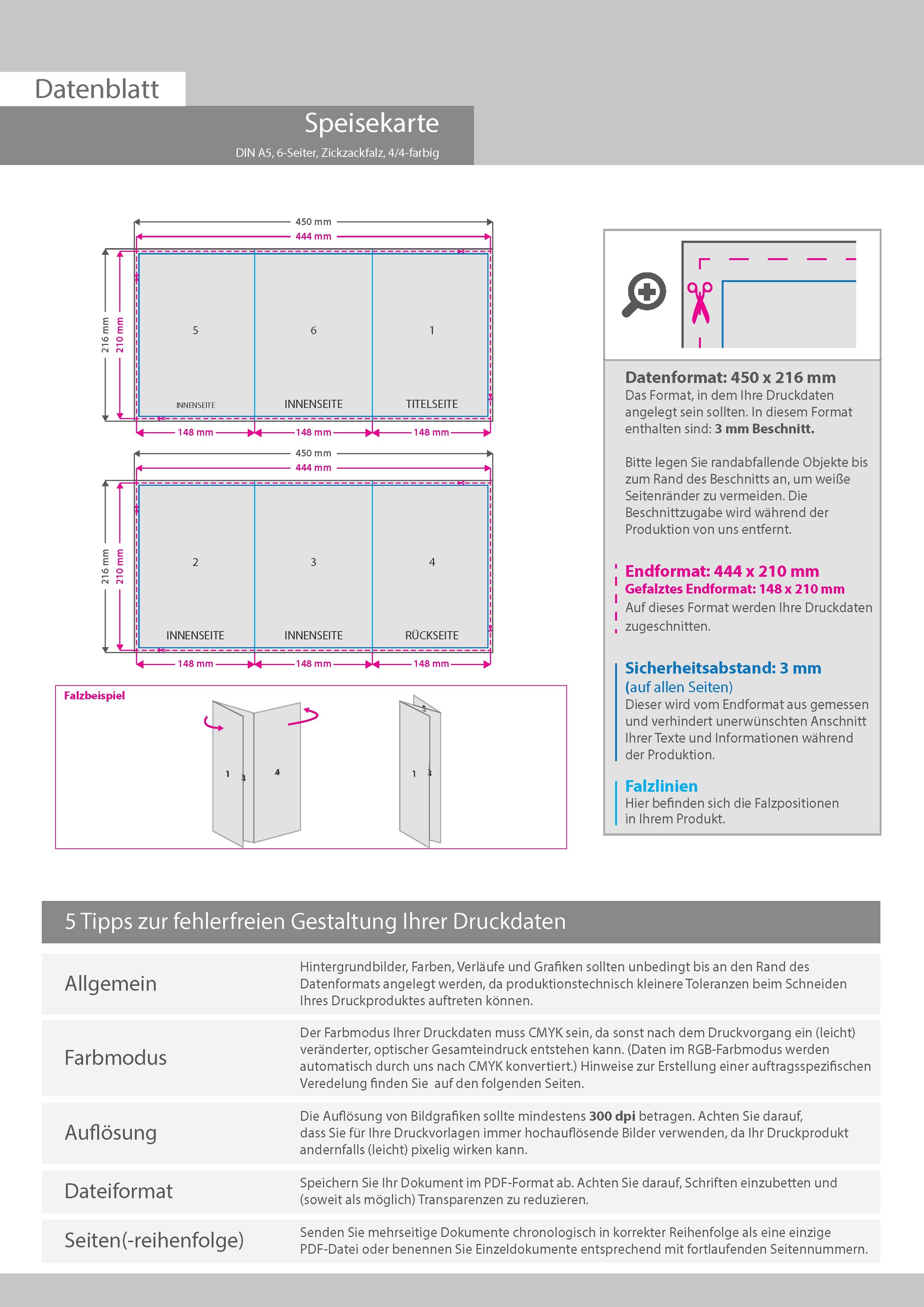 Speisekarte, gefalzt auf DIN A5, 6-seiter (Zickzackfalz)