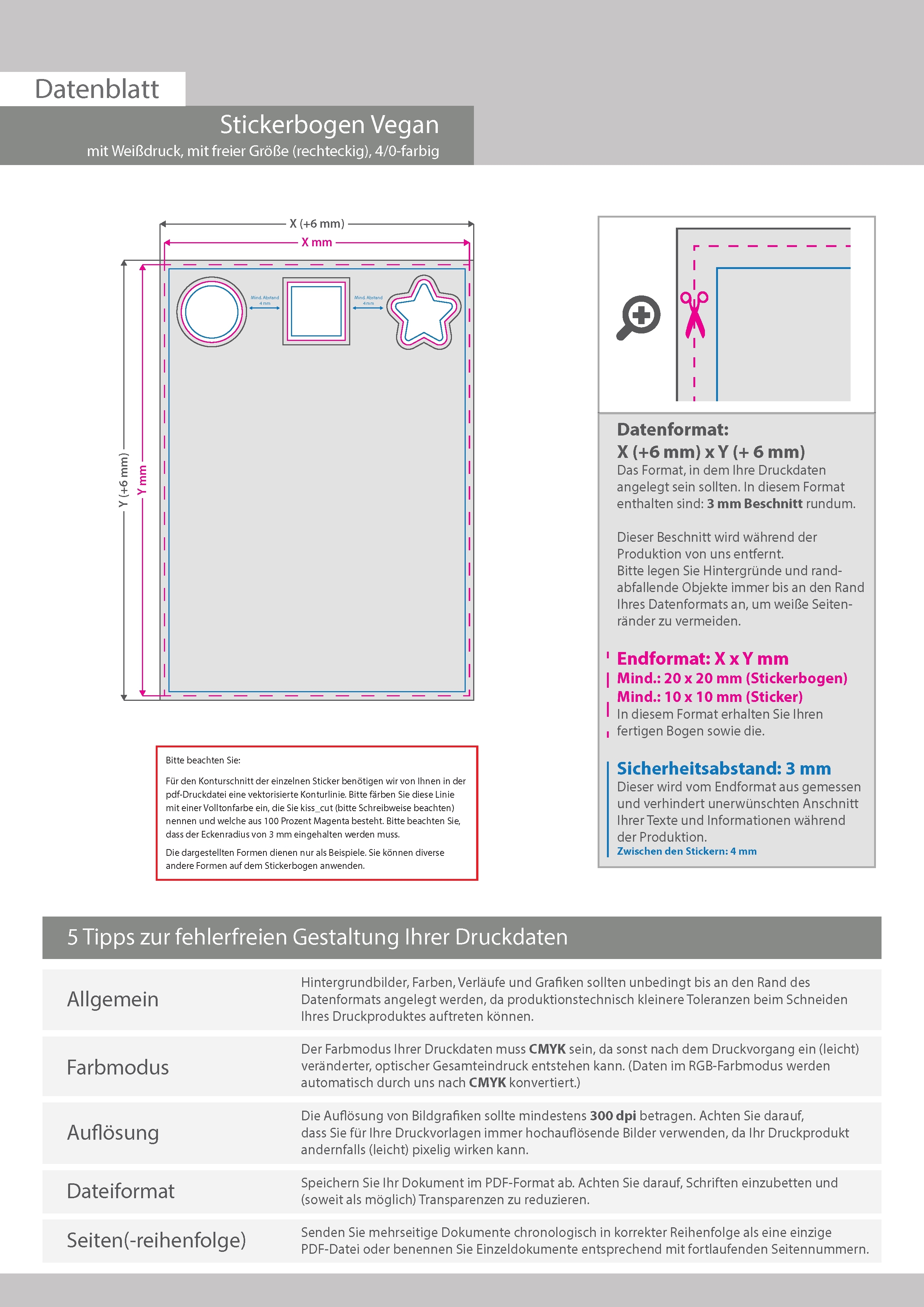 Stickerbogen vegan mit Weißdruck 4/0 farbig bedruckt mit freier Größe (rechteckig)