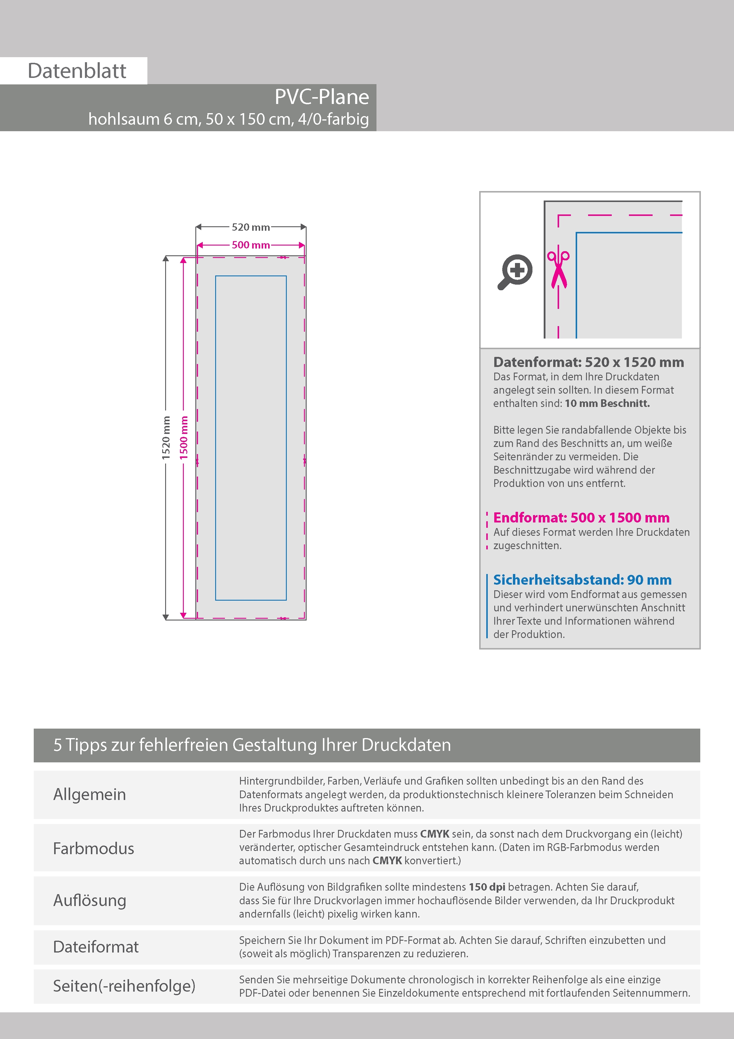 Hochwertige PVC-Plane 50 x 150 cm, 4/0-farbig bedruckt, Hohlsaum oben und unten (Durchmesser Hohlsaum 6,0 cm)
