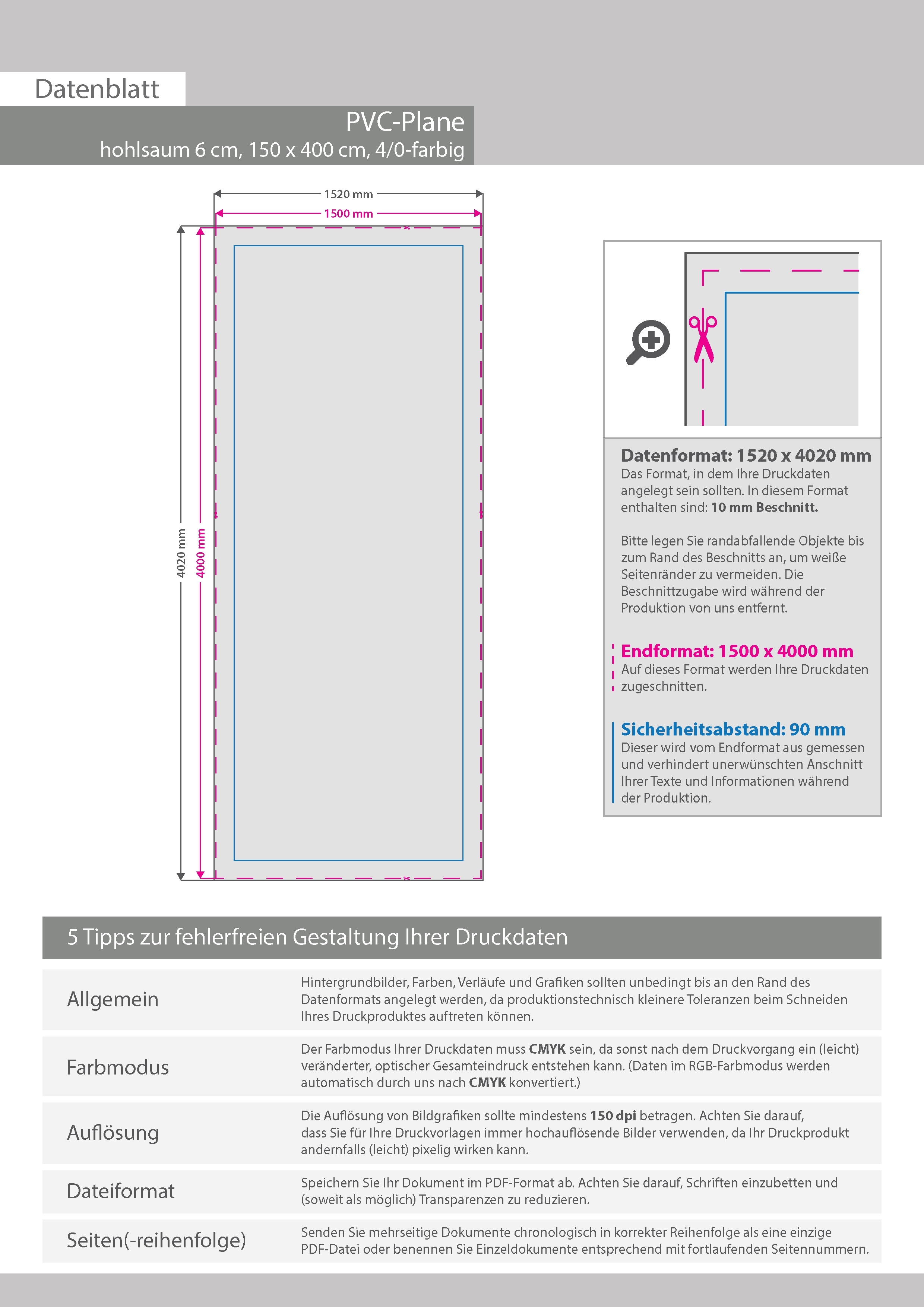 Hochwertige PVC-Plane 150 x 400 cm, 4/0-farbig bedruckt, Hohlsaum oben und unten (Durchmesser Hohlsaum 6,0 cm)