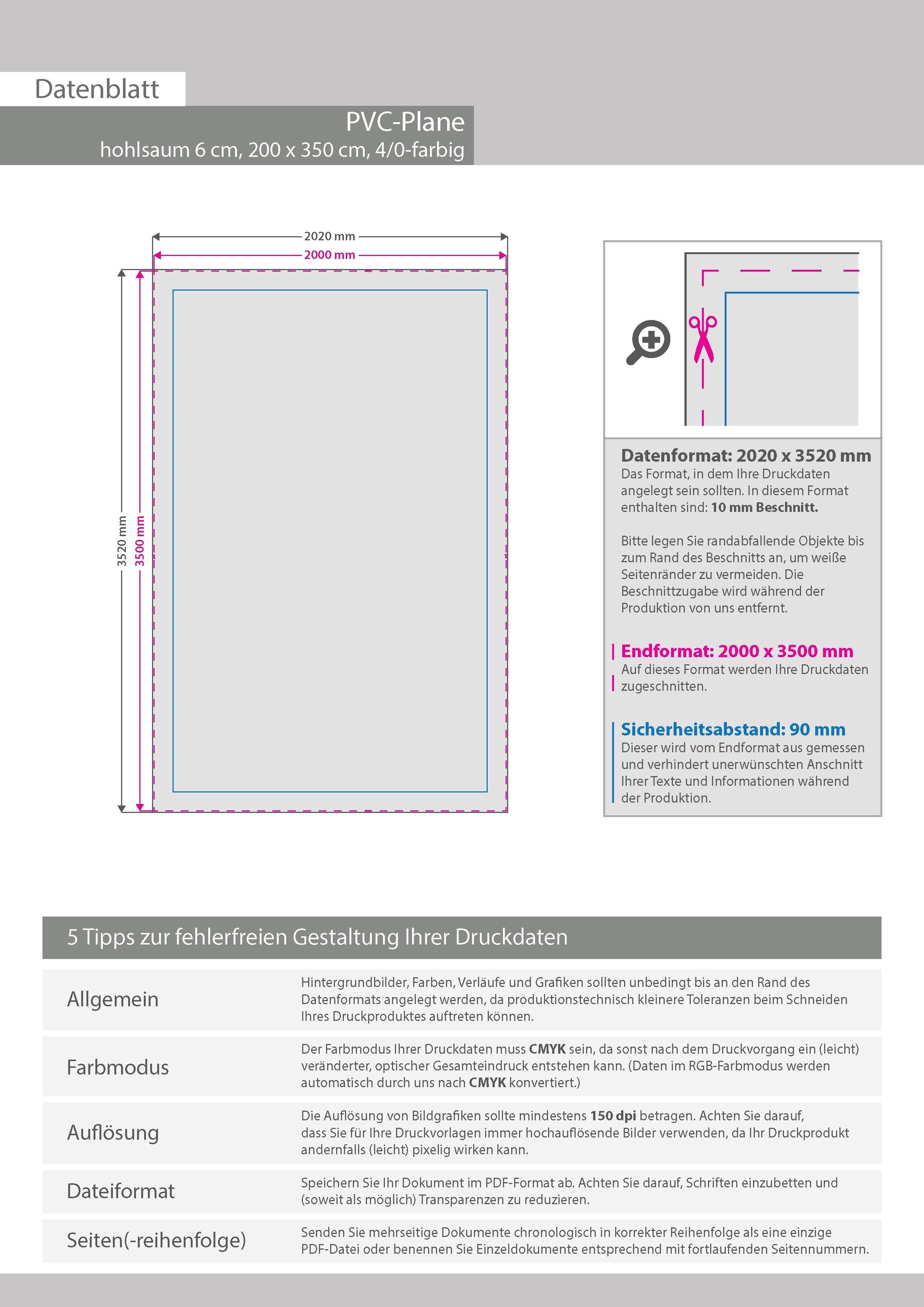 Hochwertige PVC-Plane 200 x 350 cm, 4/0-farbig bedruckt, Hohlsaum oben und unten (Durchmesser Hohlsaum 6,0 cm)