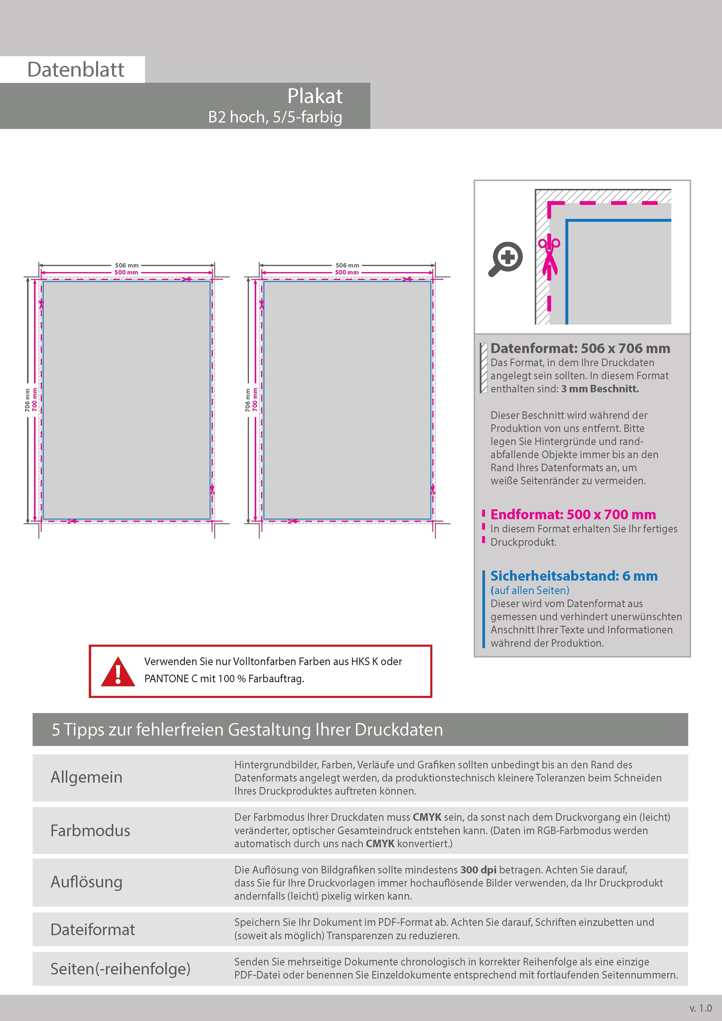 Plakat B2 hoch (500 x 700 mm) beidseitig 5/5-farbig bedruckt (CMYK 4-farbig + 1 Sonderfarbe HKS oder Pantone)