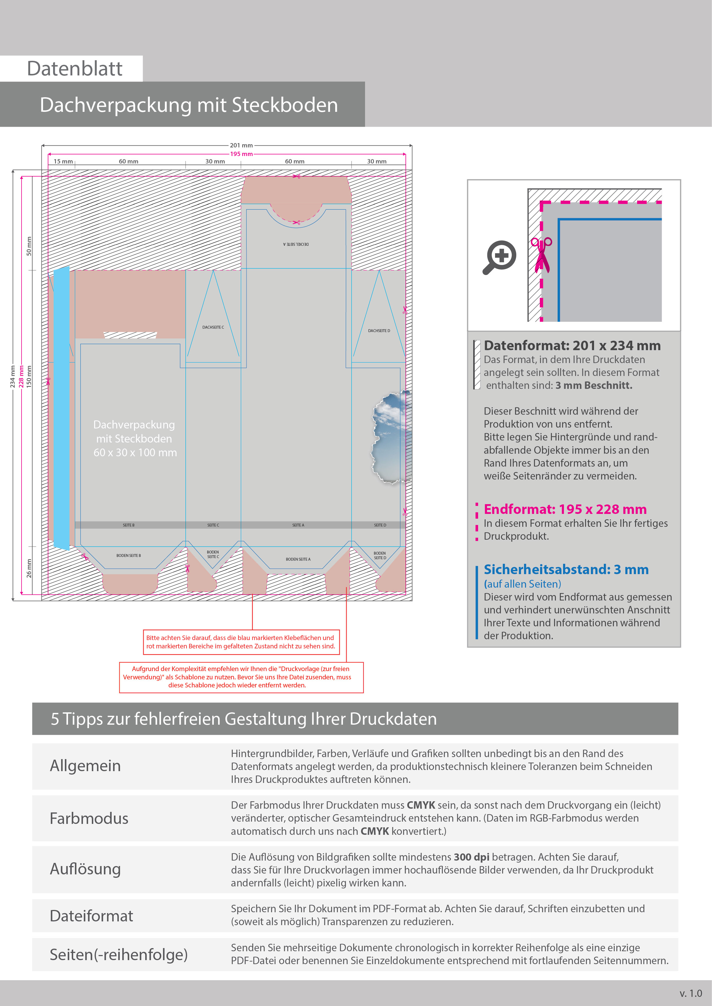 Dachverpackung mit Steckboden mit Längsnaht (6 x 3 x 10 cm plus Dach) einseitig bedruckt 4/0-farbig