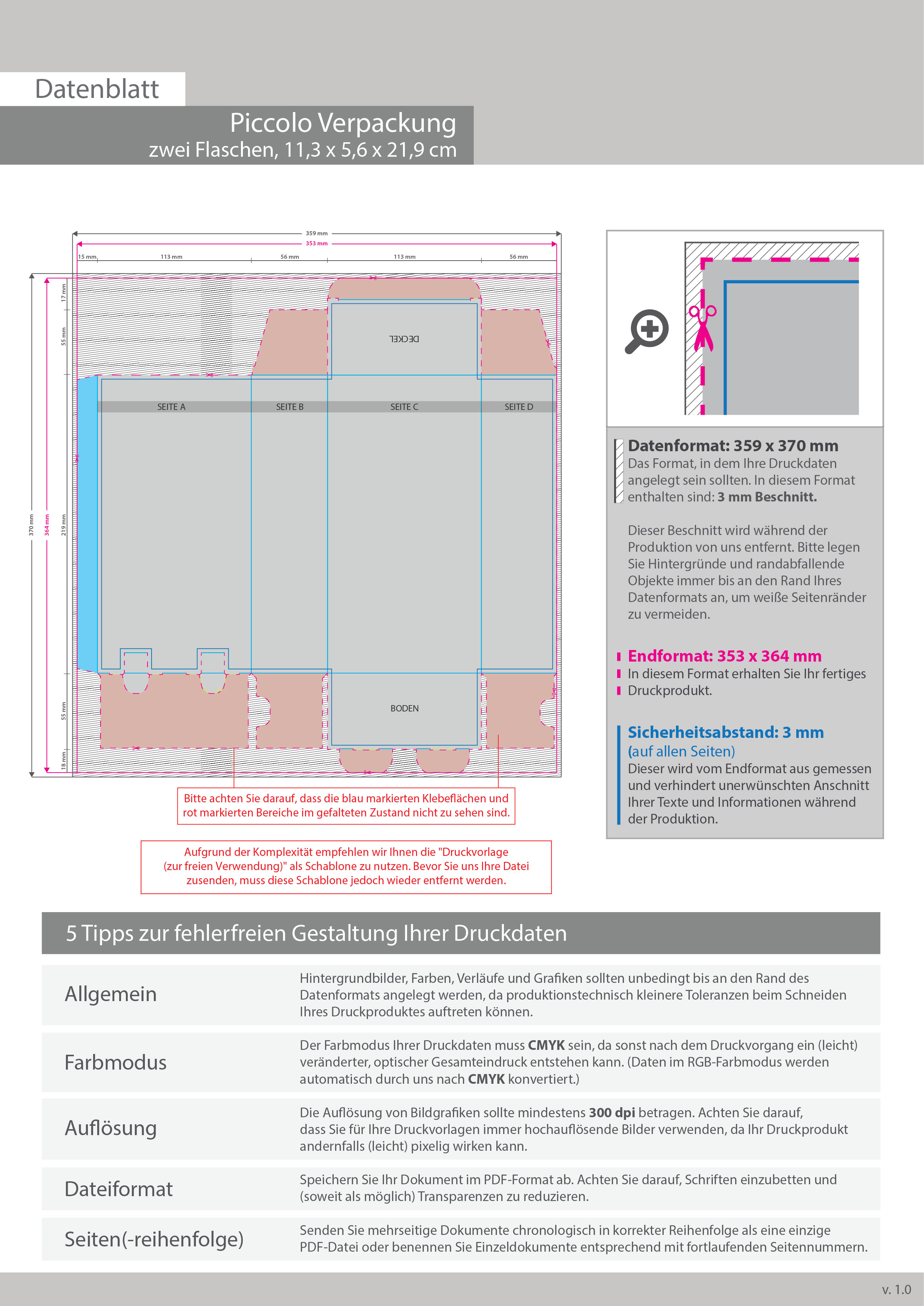 Piccoloverpackung für zwei Flaschen (11,3 x 5,6 x 21,9 cm) einseitig bedruckt 4/0-farbig