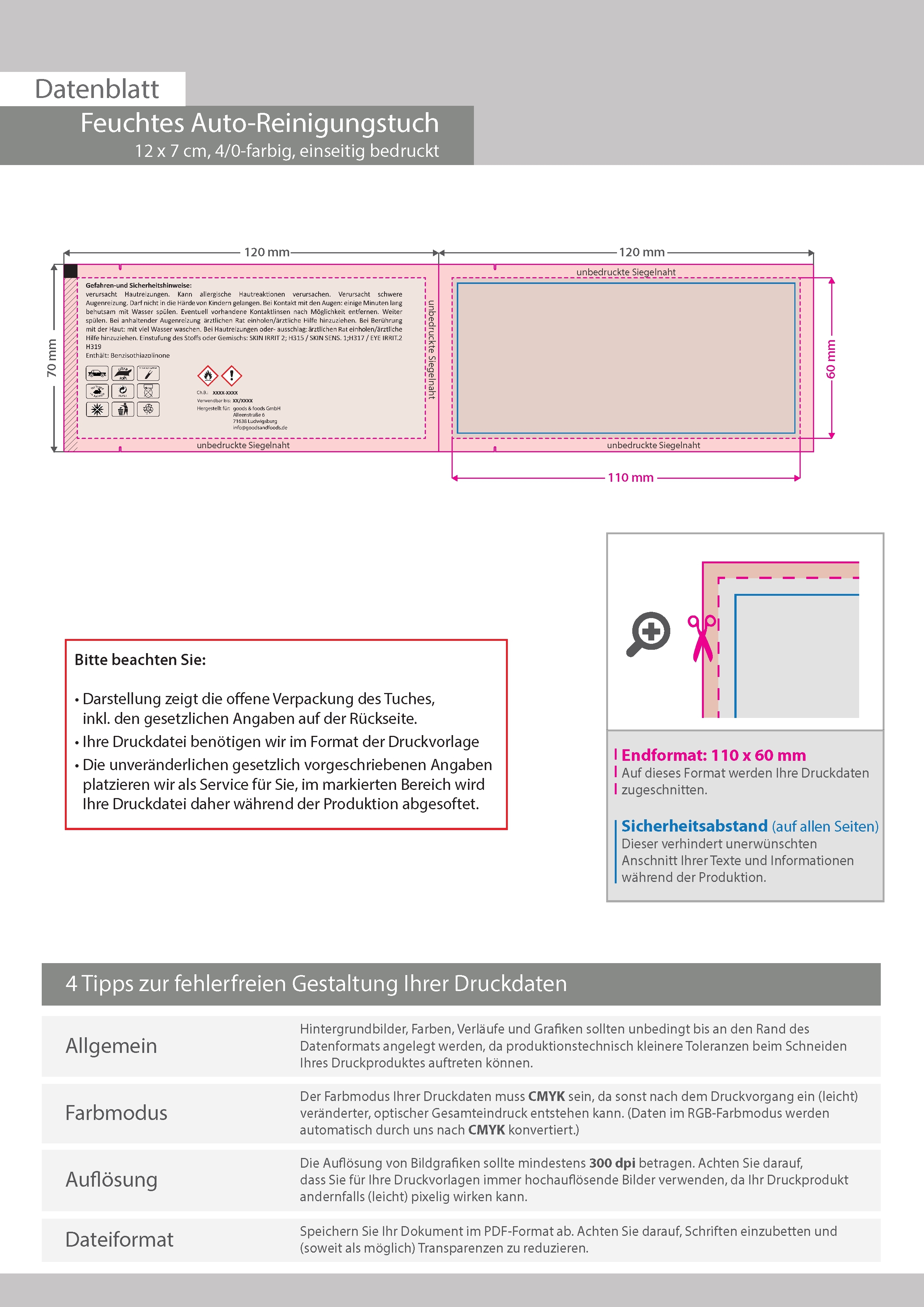Feuchtes Auto-Reinigungstuch, 12 x 7 cm, 4/0-farbig einseitig bedruckt