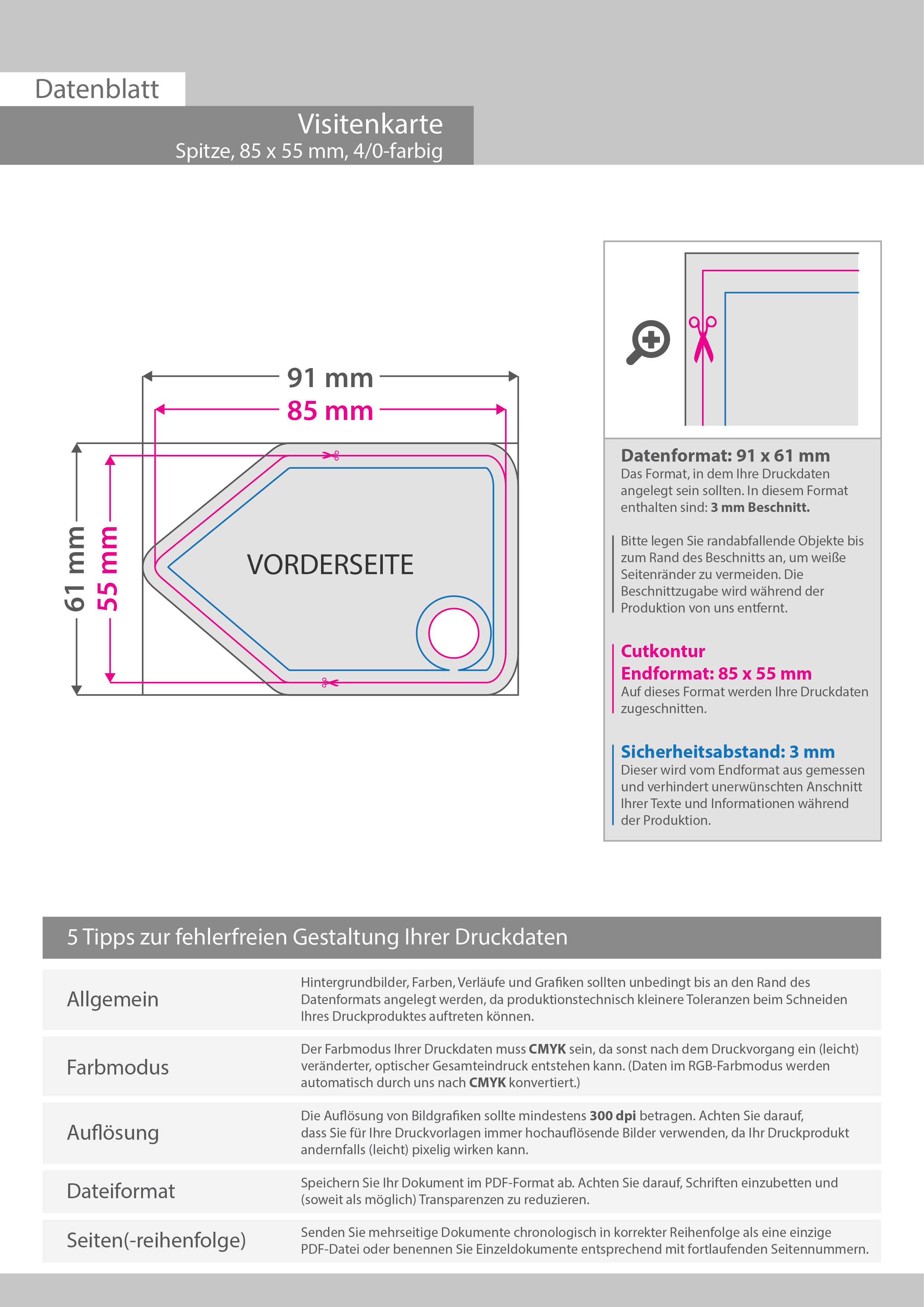 Visitenkarte Spitze, 85 x 55 mm, 1-seitig, 4/0-farbig CMYK