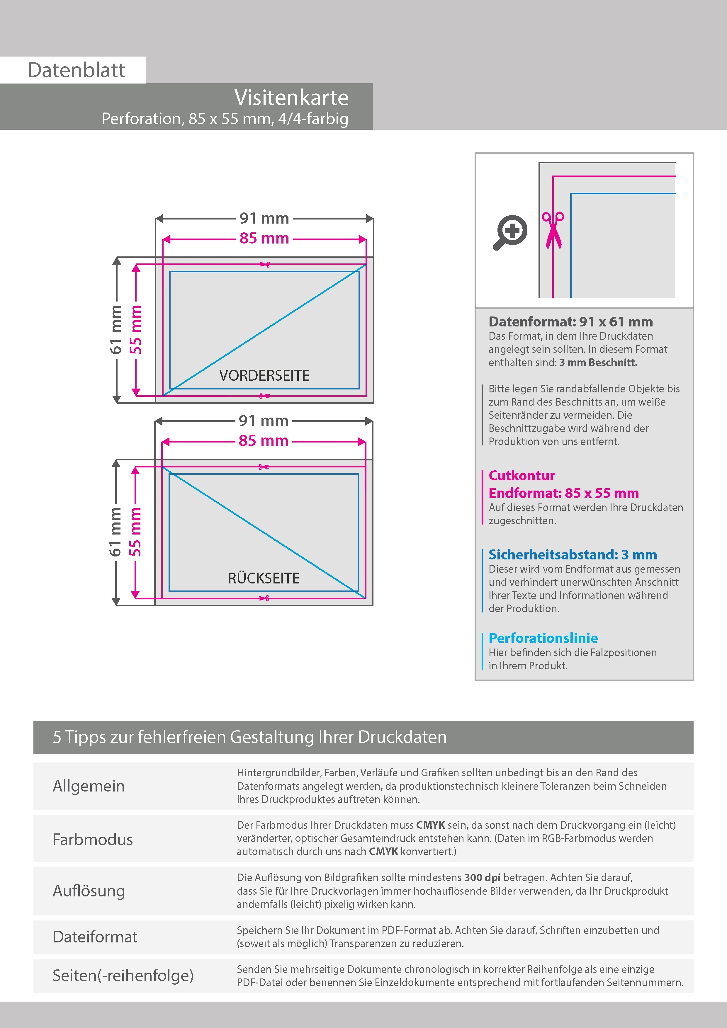 Visitenkarte Perforation, 85 x 55 mm, 2-seitig, 4/4-farbig CMYK