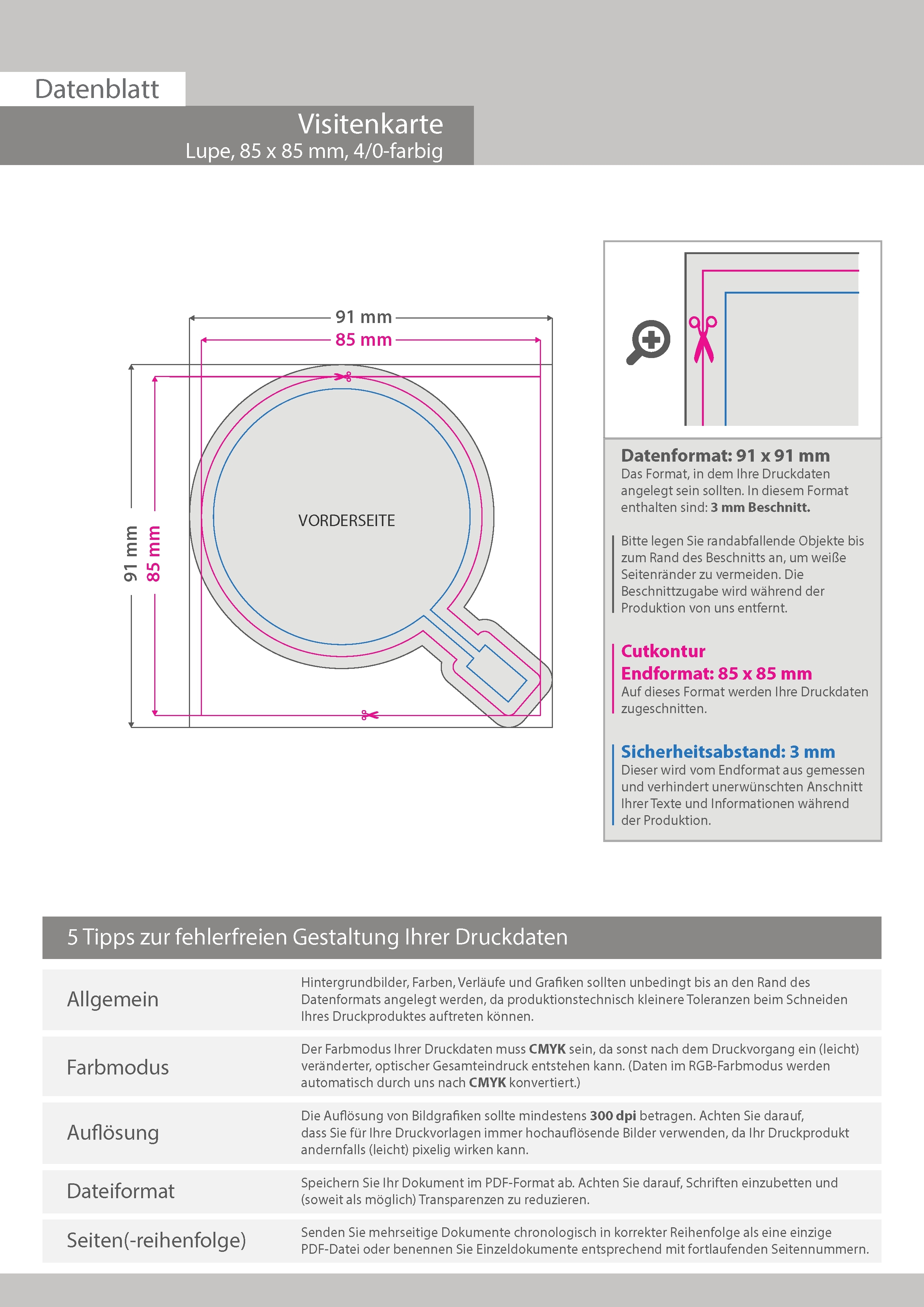 Visitenkarte Lupe, 85 x 85 mm, 1-seitig, 4/0-farbig CMYK