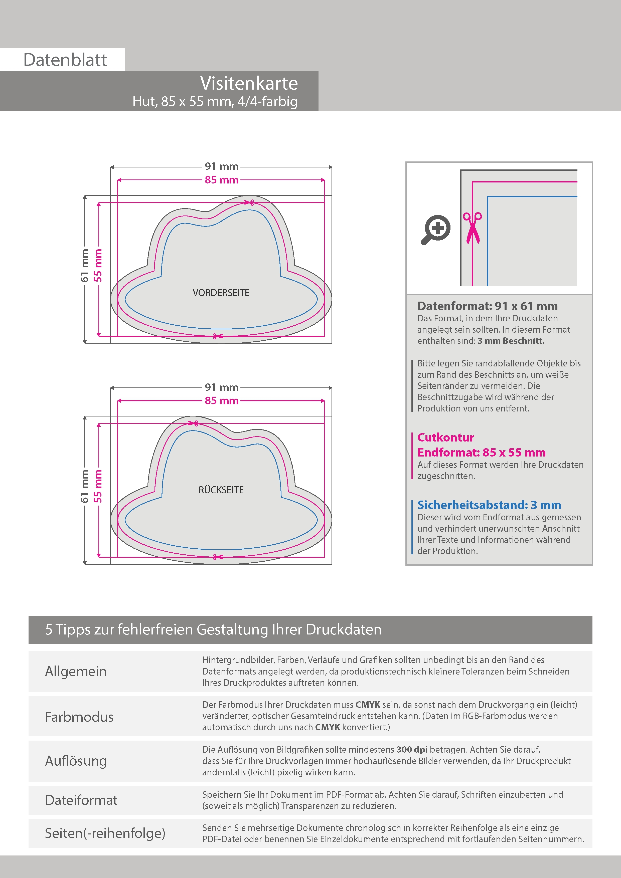Visitenkarte Hut, 85 x 55 mm, 2-seitig, 4/4-farbig CMYK