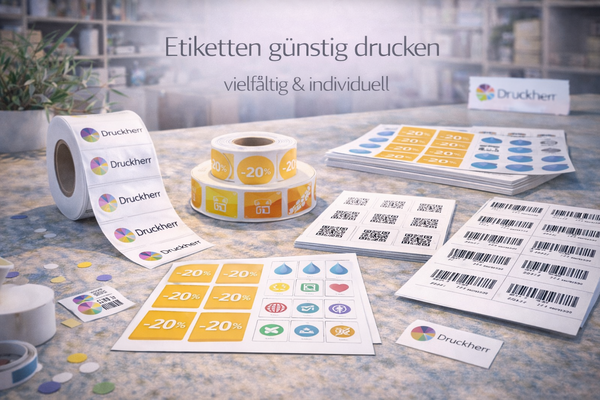 Individuell gedruckte Etiketten sind vielseitig einsetzbar: für Produktkennzeichnung, Verpackungen, Lagerung, Organisation oder Marketing-Aktionen. Bei Druckherr können Sie Etiketten günstig und in bester Qualität drucken lassen – ganz nach Ihren Vorstellungen.